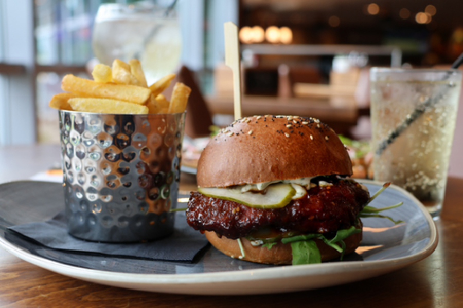 - Crispy glazed chicken burger - Asian glazed crispy chicken, brioche bun, pickled cucumber, rocket, coriander mayonnaise, skin on fries